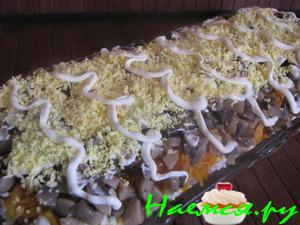 Селёдку очистить,освободить от внутренностей, кожи и костей,филе мелко нарезать.Грибы порезать,обжарить в раст.масле до готовности,отдельно обжарить мелко нарезанный лук,с грибов и с лука удалить масло,грибы и лук перемешать,посолить по вкусу.На плоское блюдо слоями выкладываем:филе селёдки,мелко нарубленный зелёный лучок,картофель на тёрке,смазываем майонезом,затем грибочки с луком,дальше яйца на тёрке(немного белка оставить для украшения),майонез,и морковь на тёрке,разровнять ,кончик "хвоста" выложить белком и майонезом.Такое сочетание ,как селёдка и грибы было для меня не совсем обычным,но очень вкусно! Нам понравилось!