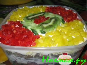 5 слой- грибы маринованные в коньяке, смазываем майонезом и посыпаем зелёным луком.