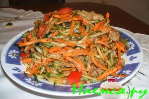мясо порезать полосками и замариновать в уксусе на 1час,затем довести до закипания ,слить и остудить.Лук порезать соломкой промыть холодной водой и замариновать в уксусе на 30мин.,морковь натереть на тёрке как на корейскую марковку,лук слить соединить с марковкой и мясом,масло перекалить и добавить в салат.Соль ,перец,уксус,сою по вкусу
