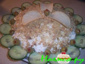 1-помятые чипсы перемешаные с луком и майонезом,нарезаным полукольцами,чтоб лук негорчил запарить его кипятком на пару минут.