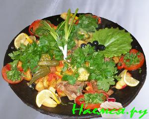 Баклажаны,помидоры,перцы проткнув ножом со всех сторон выпекаем в духовке. После полного приготовления, очищаем от кожуры и мелко нарезаем. Добавляем мелко нарезанную зелень (зеленый лук (можно репчатыйлук) базелик (рейхан), или кинзу). Салат заправляем растительным маслом, соль и перец добавляется по вкусу.