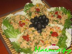 булгур залить кипятком,накрыть крышкой(набухнет).Обжарить мелконарезанный лук,добавить томатную пасту,обжарить.Выложить в булгур,перемешать,Нарезать помидор(кубиками ),листья салата.Смешать с булгуром.Посолить,поперчить,добавить петрушку,лимонный сок,перемешать.Салат готов.