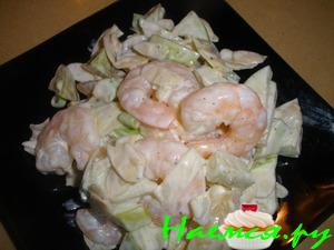 для заправки смешаем майонез со сливками, солью и в конце добавим слики, заправить салат. готовый салат поставить на 1 час в холодильник.