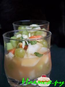 Для пудинга:Взбить все фрукты+мята в миксере,перерожить в кострюлю дать закипеть,отключить,добавить желатин,хорошо размешать,остудить,разлить по формам.