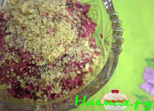 Салат укладывают слоями. 1 - белки, мелко нарезанные