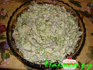 Говяжий язык отварим, очистим и нарежем соломкой, перемешаем с майонезом и выложим на дно салатника - это первый слой.