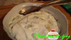 Всё смешайте. В отдельной посуде перемешайте майонез и сметану. Заправьте салат.