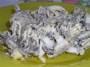 отварить язык. почистить, остудить. язык, конечно же, можно использовать и говяжий, написала про свиной, чтобы было понятнее, какое количество языка пошло в салат, хотя в таких салатах пропорции ингредиентов можно изменять по вкусу