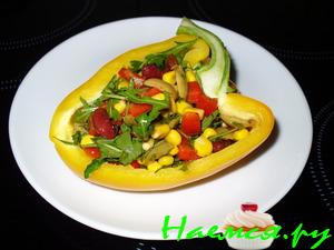 Фасоль промыть,горох,кукурузу слить,лук ,паприку порезать сложить в миску. Приправу для салата развести маслом ,посолить,поперчить и всё смешать .
