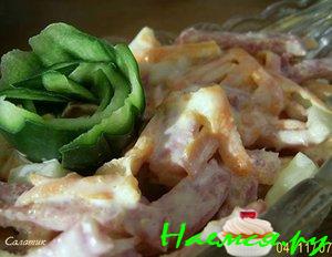 Колбаску, перчик, грибочки, крабовые палочки и укроп мелко порежьте.