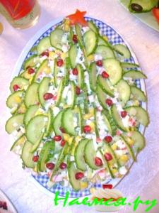 Все ингредиенты смешать (кроме огурцов), посолить, заправить майонезом или сметаной, перемешать. На плоской тарелке сформировать салат горкой. Нарезать тоненькие полоски огурца и, начиная с макушки по часовой стрелке наискось поочередно, вдавливаем их в салат и так до самого низа.