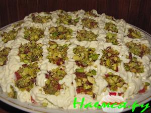 Первым слоем "идёт" курица, промазать майонезом. Потом сыпем фисташки, затем помидоры и майонез.