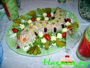 Картошку и яйца отварить. Натереть на терке, сырки тоже натереть. Горбушу измельчить вилкой. Чеснок выдавить прессом. Заправить майонезом и хорошо перемешать. Украсить как на фото.