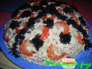 Когда выкладываете салат, старайтесь придать ему форму морской раковины. Сверху украсить салат креветками и красной икрой.