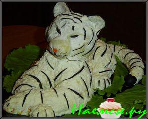 картофель трем на терке! выкладываем из него глову тигра (делаем круг и сверху два ушка). режем колбасу кубиками , выкладываем сверху слоем на картофель, смазываем майоннезом, режем кубиками огурец выкладываем слоем на колбасу, смазываем майонезом, измельченный лук выкладываем слоем на огурцы, желток яйца выкладываем на лук мажим майонезом и последним слоем выкладываем тертую морковь, так чтоб она полность покрыла все яйцо. делаем глазки носик из чернослива, щечки из тертого белка и из кусочка колбасы язычок, усы делаем из тонких полосочек лука!