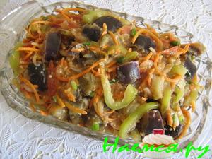 В казанке раскалить масло и обжарить в нем баклажаны до золотистого цвета. Откинуть на ситечко, чтобы стекло масло.