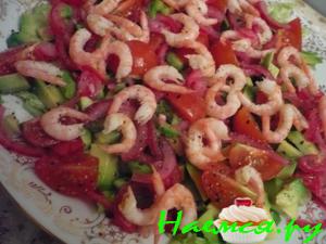 дно плоской тарелки полить смесью майонеза с кетчупом,листья салата порвать руками и разложить на соус,выложить слой яблок (нарезать соломкой),слой томатов(тоже соломкой),слой креветок(мелких),слой кальмаров(соломкой),сверху полить соусом(майонез+кетчуп)и посыпать орешками.