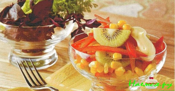 1) Киви нарежьте ломтиками, смешайте с кукурузой и нашинкованным красным перцем