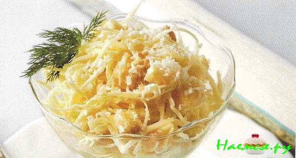 3) В салатник выложите капусту и бананы, посыпьте 3 столовыми ложками кокосовой стружки, осторожно перемешайте, посолите и заправьте майонезом. Выложите в салатник