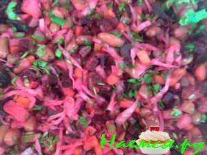 Винегрет заправить смесью масла, уксуса и горчицы, всыпать сахар, перец и соль, перемешать.