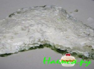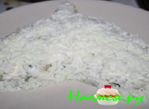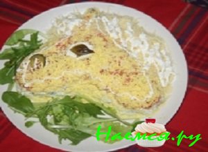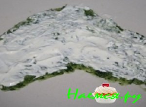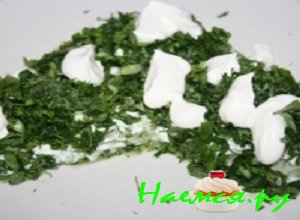 - Смешать вместе сметану и майонез, пропитать первый слой салата приготовленной заправкой.