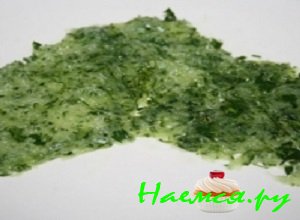 - Зелень тщательно вымыть, обсушить и мелко порубить кухонным ножом. Посыпать ею картофельный слой и немного пропитать заправкой.