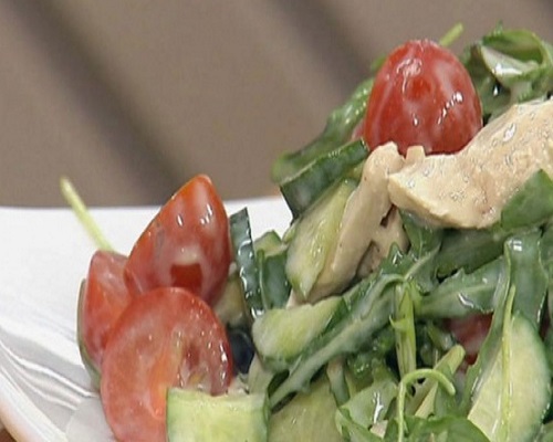 - Перемешать овощи с мясом и рукколой, сдобрить солью и слегка посыпать молотым перцем.