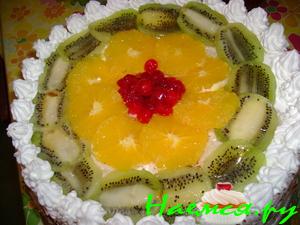 Этим кремом покрыть тонким слоем фрукты и нaкрыть вторым коржом.