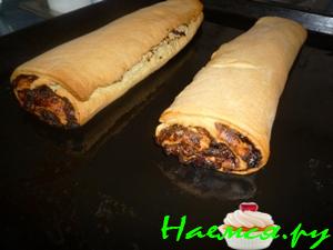 Замесить тесто, разделить его на 3 части. ( У меня тесто получилось немного липнущим к рукам). Раскатать коржи на посыпанной мукой поверхности. На раскатанные коржи разложить начинку из сухофруктов, свернуть рулетом и выпекать около 25-30 минут при 200С. Рулеты горячими разрезать на кольца шириной 2 см. Кольца обмакнуть в крем (сметану взбить с сахаром) и выложить на блюдо по кругу в 3 слоя. Оставить на ночь пропитаться.