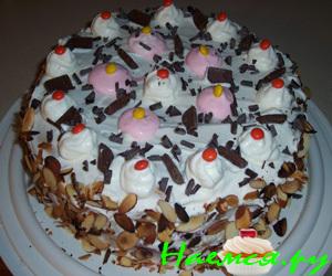 берем корж, пропитываем его соком вишнёвым, мажем его взбитыми сливками,сверху выкладываем вишни и орехи,накрываем вторым коржом обмазываем весь торт кремом и украшаем по желанию.
