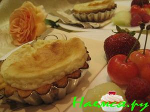4. Нагреть гриль. Взбить белки в крепкую пену, всыпая постепенно сахар. Вынуть тарталетки из холодильника, поставить на выстеленный бумагой противень. Сверху выложить столовой ложкой белки. Тарталетки поместить под гриль на самый нижний уровень на 5 минут.