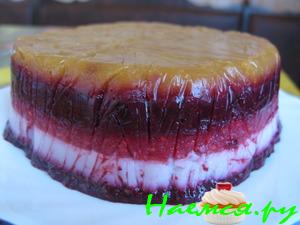 желе для торта и сахар развести в 250 мл.воды,довести до кипения при постоянном помешивании и снять с огня.Дать немного остыть,затем осторожно вылить желе на фрукты.