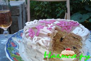 Остывшие коржи смазываем кремом и украшаем (орехами, шоколадной стружкой и т.д)