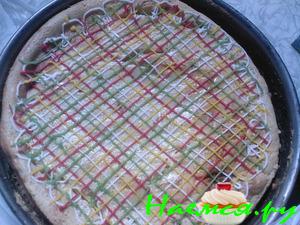 Выложить начинку на основу и выпекать в духовом шкафу при температуре 150 градусов 60 минут. Затем оставить торт-пирог в остывающей духовке еще на 15-20 минут. После достать, охладить и убрать в холодильник на 2- 4 часа.