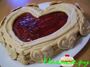 Затем - укладываем средний слой из 2-х маленьких частей. Снова – джем, сливки.