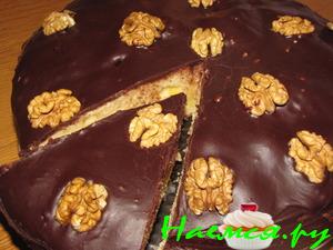 После того как всё остынет, собираем торт: одну половину промазать кремом, накрыть вторым коржом. Поставить торт на решётку и полить шоколадной глазурью. Убрать в холодильник на 30 минут.