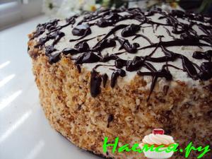 Первый корж смазать половиной шоколадного крема+ второй корж+ половина сливочного крема+грильяж+ вторая половина крема (2-3 ст.л. крема оставить для смазывания боков)+третий корж+шоколадный крем+4 корж. Бока смазать кремом. Оставить на ночь для пропитки в холодильнике.