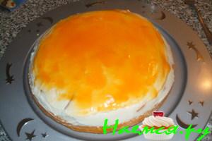 кремом,выложить абрикосы,затем вторым коржом накрыть и разукрасить ,по вашему желанию.