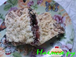 Смазать форму маслом,посыпать сухарями.Одну часть теста размять по форме,сделать бортики.Сверху положить смородиновое варенье.На варенье натереть на крупной терке тесто темного цвета,потом взбитые белки и сверху натереть белое тесто.