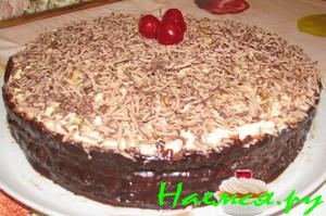 5. Коржи промазать кремом и соединить. Верх торта смазать покрытием, посыпать орехами и печеньем.