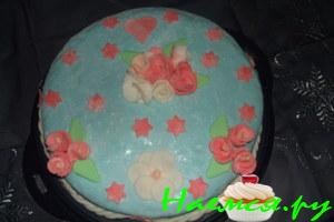 #персики слить,5 конфеток оставить для разукрашив.15шт.роше размять,варенье разогреть и смазать корж,выложить персики.Сливки взбить с загустителем и сах.пудр.,выложить крем на персики , и разукрасить.