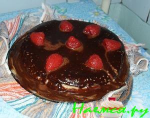 теперь укладываем наши коржики, хорошо промазываем кремом, а верхний смазываем отложенной глазурью и украшаем клубничкой.