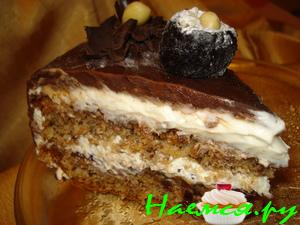 Нижний корж пропитать и намазать черносливом, нанести обильно крем. Накрыть вторым коржом, пропитать, намазать крем. Накрыть третьим коржом и повторить туже операцию. Бока торта также обмазать кремом. Поставить торт в холодильник для застывания крема. Затем покрыть торт глазурью (растопить шоколад на водяной бане, тщательно размешать со сливками).