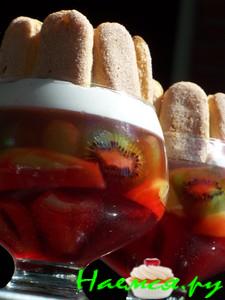 Дать остыть.Порезать квадратами и положить один на другой ,посыпать сахарной пудрой и порезанными фруктами.