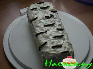 Закрутить торт в пленку, придавая форму полена.Положить торт в холодильник не менее, чем на 8 часов.
