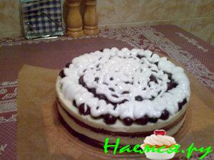4. Когда наш корж готов выкладываем его на блюдо и полностью обливаем нашим кремом, сверху покрываем взбитыми сливками и украшаем виноградом.