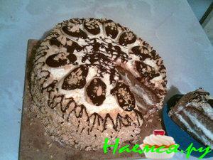 Между 4-5 коржем.вложить порезанные кусочки свежего яблока,пока не остыл крем.Накрыть последним 5-м коржем, залить шоколадным кремом.Посыпать поломанными мелкими кусочками коржа или можно кукурузными хлопьями.Посыпать тертым шоколадом и изюмом.Украсить.