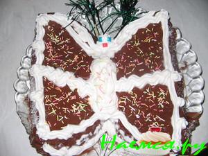 Из бисквитов я вырезала крылья бабочки,разрезала их и пропитала сиропом.Выклала крем(сгущёнка взбитая с маслом)крема должно быть много,так как торт не будет смазываться кремом сверху.