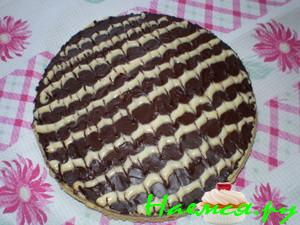 Выпеченный полуфабрикат уложить в прямоугольную или круглую форму без дна (Лучше если противень с раздвижными бортами)(можно склеить из бумаги плотной), покрыть слоем крема, затем положить второй полуфабрикат и сверху опять нанести слой крема, заполняя форму до краев.