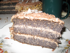 Сверху на крем выложить вишни и притрусить дробленными грецкими орехами.